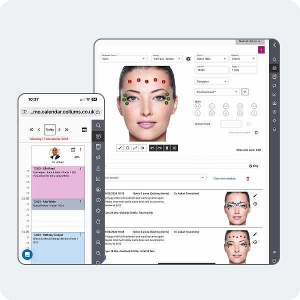 “I’ve found that using software to document treatment notes digitally can be slow and cumbersome. Collums is the first software that I’ve found that doesn’t slow me down but still enables me to document all the details I need. You can even see all your previous treatments with facemaps on the same page as writing your latest notes! This is how it should always have been done.”